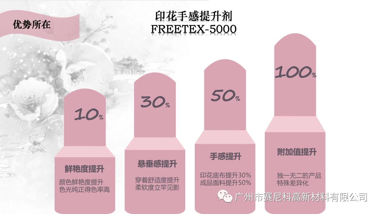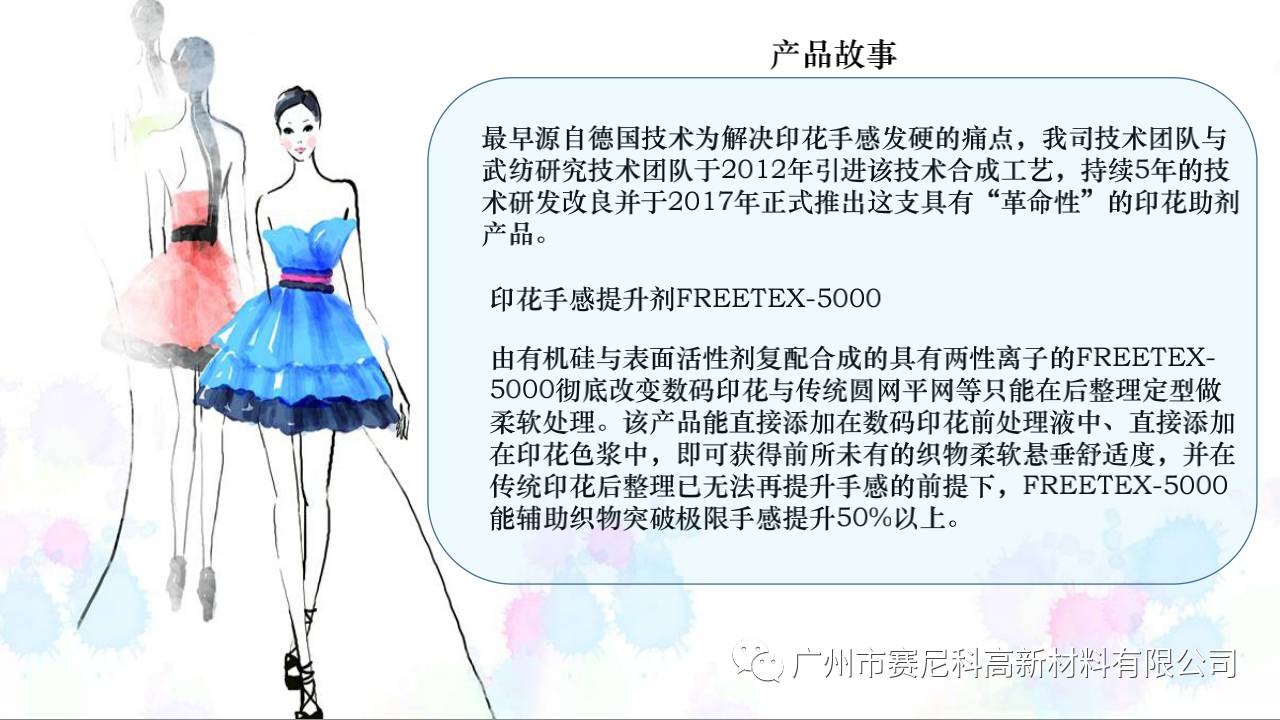 一款能添加在印花浆的“手感提升剂”,突破传统印花概念,能最大限度提升印花浆的手感从而整体改善印花底布的手感舒适度与悬垂度。