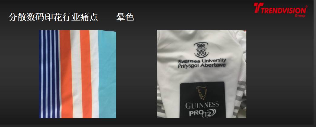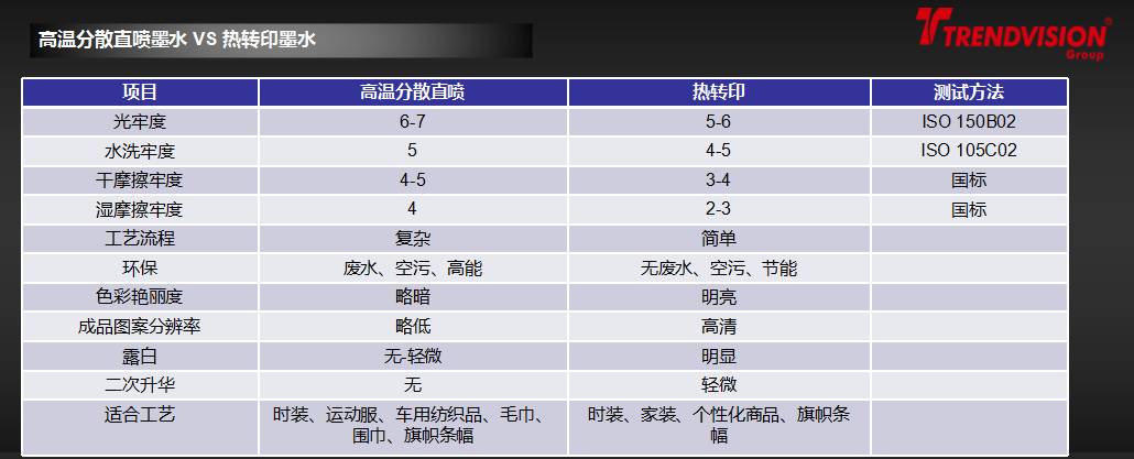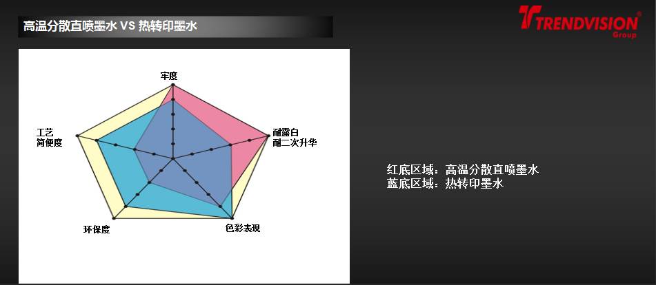 在150℃可被升华,色牢度的各项指标在4级以上,非常适合用于热转印工艺、旗帜横幅直喷工艺。但不适合用于染料工艺及服饰直喷工艺(会晕色,尤其在黑色最严重)。