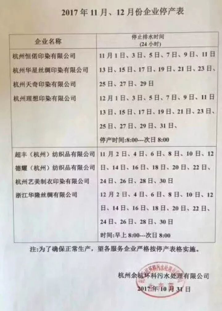 8 | 浙江日通实业股份有限公司 | 瓶窑镇 | 印染生产线关停 |