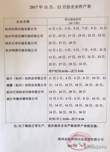 紧急通知:8家纺织印染厂(见下图名单),自11月1日起至12月30日止,分单日(1、3、5、7、9...)和双日(2、4、6、8、10...)每天轮流停产24小时!每家印染厂共计停产30天和31天!