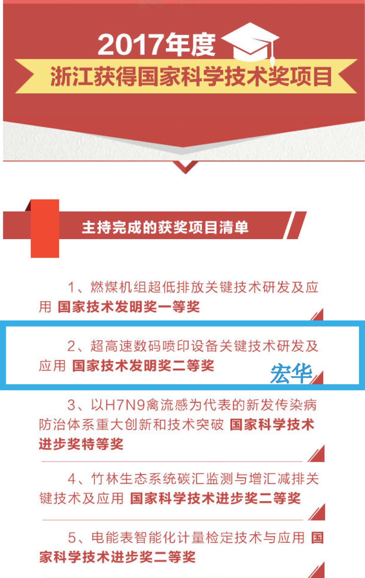 1月8日,2017年度国家科学技术奖励大会在北京人民大会堂隆重举行,这是中国政府关于科学技术最高规格的颁奖盛典。其中杭州宏华数码科技股份有限公司主持完成的“超高速数码喷印设备关键技术研发及应用”荣获国家技术发明二等奖。