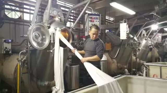 热水清洗大多用于酸性、直接和碱性染料染色的丝绸或合纤及其交织物。若得色偏深,需去除染物1~2成的染料,可采取70~80℃热水洗。丝织物热水洗浴中可添加0.3~0.5L的平平加0(匀染剂);涤纶、锦纶等合纤混纺交织物,则可加人0.5~1.0L的修补剂或染色载体。由于热洗浴中添加的助剂量少,织物只需用流动水洗至室温即可。如染色织物采用阳离子固色剂和柔软剂等处理,最好在热洗浴中追加2~4L分散剂DAM。热水洗(修复)原则上在原染色设备上进行,如尼丝纺、醋酯纤维及其交织绸类卷染后,若改用溢流机(绳状)热水洗,会使织物产生永久折皱。